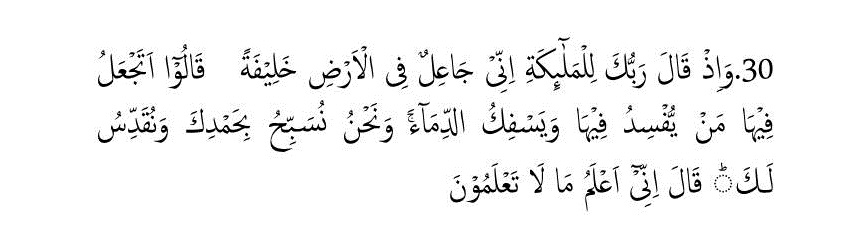 Y cuando le dijo Tu Señor a los ángeles, voy a colocar un ‘vice rigente’ en la tierra. Dijeron: ¿acaso vas a colocar en ella, quien esparza la corrupción y derrame la sangre, mientras nosotros te glorificamos con tus alabanzas y Te Santificamos? Dijo: Ciertamente yo sé lo que ustedes no saben.