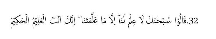 Los ángeles glorificaron a Allah diciéndole que ellos no saben excepto lo que Allah les ha enseñado. Porque el conocimiento de los ángeles sobre el mundo es limitado, ya que ellos no fueron diseñados para habitar la tierra en cambio Adam fue creado para habitar la tierra, por ende, Allah lo preparó con el conocimiento necesario. Los ángeles declaran que el conocimiento infinito es de Allah.