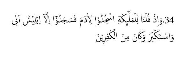 Y cuando le dijimos a los ángeles: Postraos ante Adam, se postraron excepto Iblis! Se rehusó y se llenó de arrogancia y así fue de los Incrédulos.