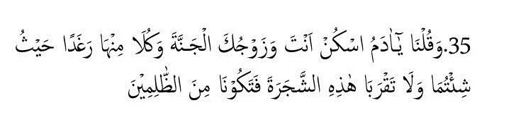 Allah le dijo a Adam que se estableciera en el paraíso con su esposa, ‘sukun’ significa quedarse en un lugar después de haber estado en movimiento. Por este verso deducimos que Allah creo Adam, le enseñó todos los nombres y estuvo en compañía de los ángeles y luego le permitió la entrada al paraíso.