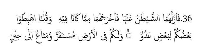 Y entonces el Shaytan los hizo caer (de la obediencia) y los hizo salir del (goce) en el que se encontraban, y les dijimos: Desciendan! Algunos serán enemigos de los otros. Para ustedes habrá en la tierra una morada y provisión por un tiempo.