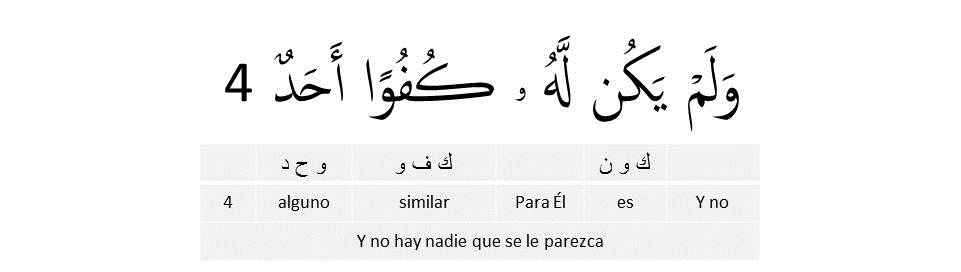 كفواً: proviene de la raíz ك ف و que significa pareja, compañero, alguien similar del mismo nivel, estatus, con características similares y con compatibilidad. Para Allah no hay nadie ni nada igual.