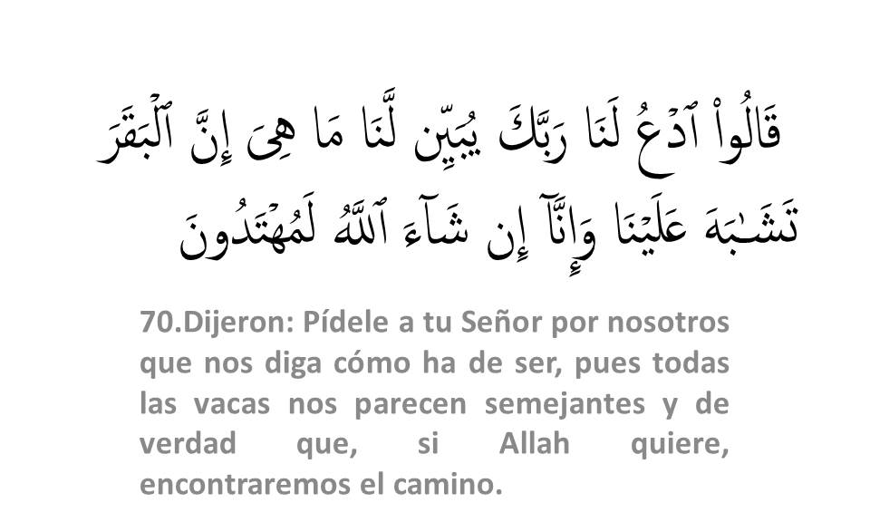 En ese momento se dieron cuenta que estaban en problemas y la situación solo se estaba empeorando para ellos mismos. En ese momento volvieron a preguntar cómo debía ser la vaca y dijeron ‘ si Allah quiere’ seremos de los guiados, es decir, Allah nos guiará a la vaca correcta. Imam ash shawqani dice que debido a hacer mencionado ‘si Allah quiere’ ´pudieron encontrar la vaca.