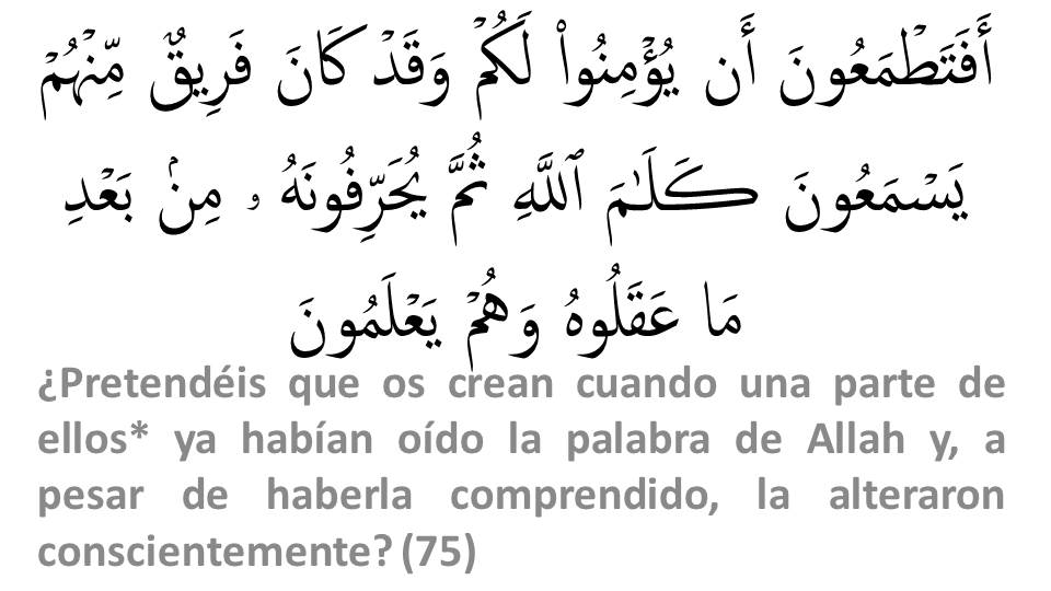 Este verso se refiere a los esfuerzos de los Musulmanes por invitar al Islam a los hijos de Israel, Allah les recuerda que ellos han escuchado la palabra de Allah, y después de entenderla la han distorsionado a sabiendas. Esto se refiere a la Tora y los mandamientos de Allah que han sido cambiados por los hijos de Israel a lo largo de la historia.