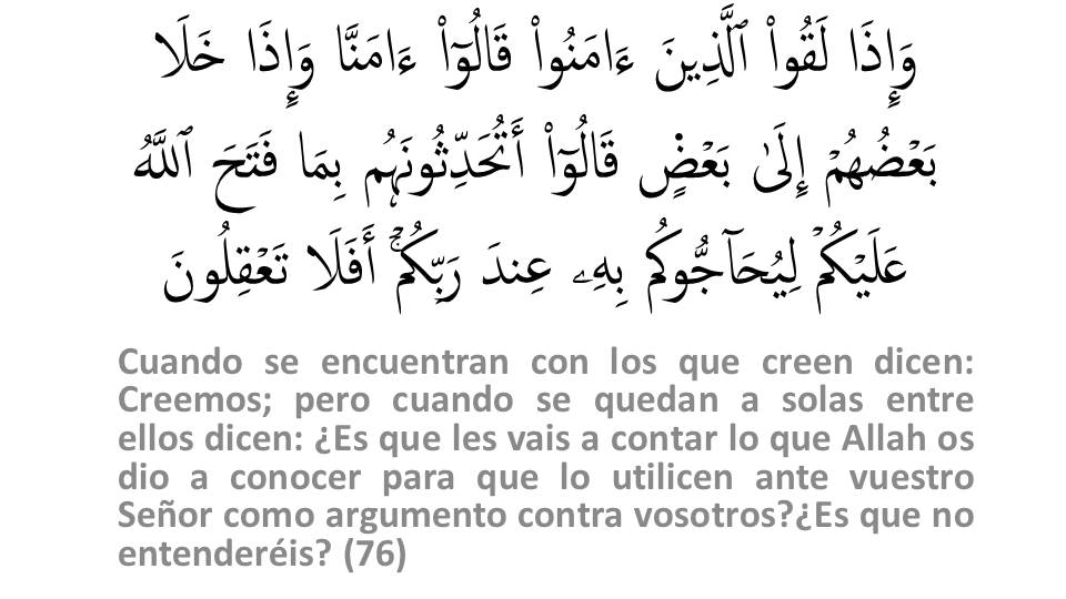 Algunos de los Hijos de Israel, al ver el poder que tenían los musulmanes se aliaban a los hipócritas y pretendían creer cuando estaban en su compañía, les informaban sobre lo que decía la Torá que confirmaba la veracidad de la profecía de Muhammad. Por ende, los otros que no estaban intentando ganarse los favores de los Musulmanes, al encontrarse con los judíos hipócritas les advertían sobre no contarle a los musulmanes lo que decía la Torá para así evitar que su propio libro se convirtiera en un argumento contra su incredulidad.