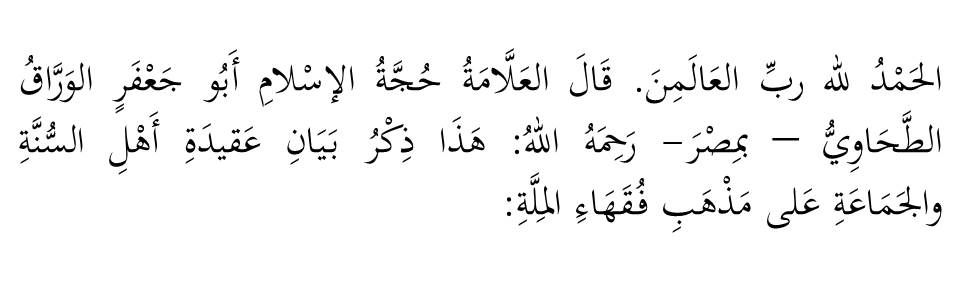 La Alabanzas son solo para Dios, Señor de los Mundos, el más sabio, Prueba del Islam, Abu Ja’far Al Qaraq At Tahawi, (de Egipto) Que Dios tenga misericordia de él, afirma que el siguiente es una exposición del credo de la gente de la tradición profética y de la mayoría de los sabios (ahl Sunnah wal jama’ah) de acuerdo a la comprensión de los juristas musulmanes como: