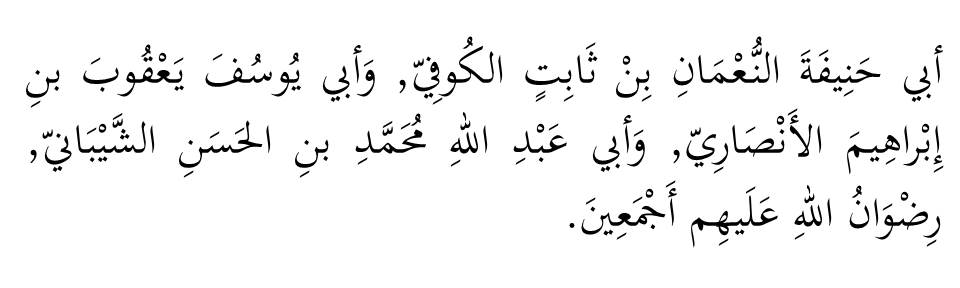 Abu Hanifa al Nu’man b thabit al Kufi, Abu Yusuf Ya’qub Ibrahim al Ansari y Abu Abdallah Muhammad b, Al Hasan Al Shaybani. Que Dios este complacido con todos.