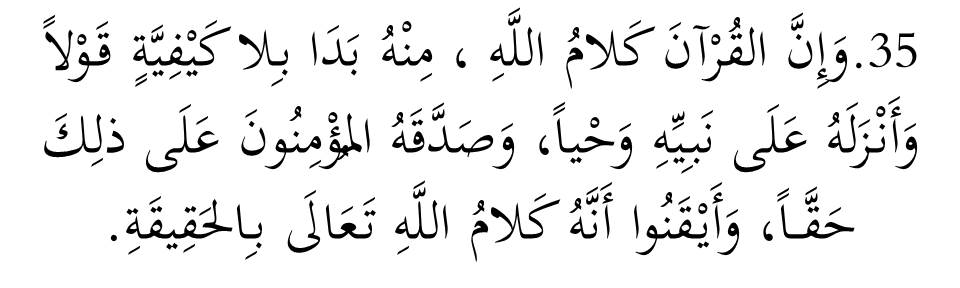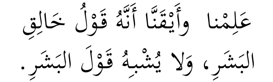 Y ciertamente El Quran es la palabra de Allah El Altísimo Vino de Él sin la apariencia de un discurso Él lo descendió sobre Su mensajero como Revelación Los creyentes lo aceptan como la verdad absoluta. Tienen la certeza que es, en verdad la palabra de Allah.