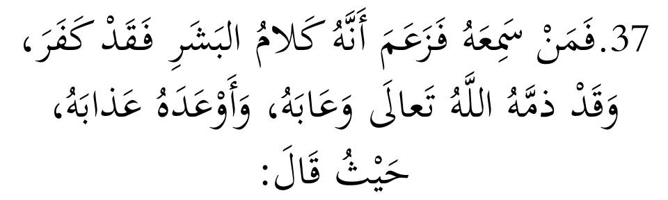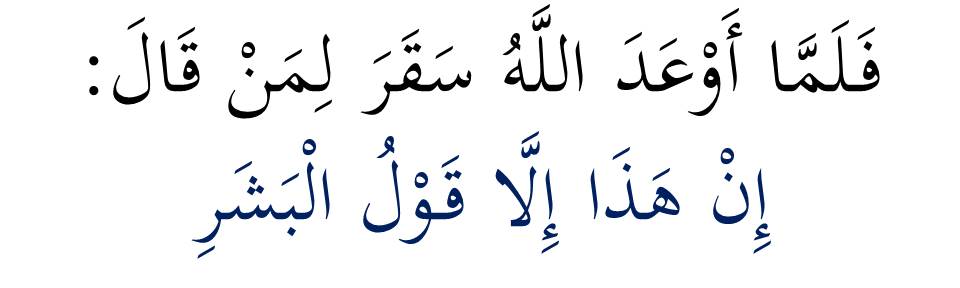 Y quien escuche el Quran y afirme que es el discurso de un humano ha cometido blasfemia. Allah les advierte y los censura y los amenaza con el fuego cuando Él dice, exaltado sea: