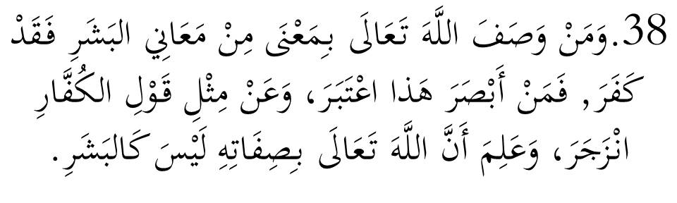 Quien describa a Allah con un significado que aplique al hombre ha cometido blasfemia Todos los que perciban esto, tomarán precaución y se alejarán de decir palabras como aquellas de los incrédulos, y sabrán que Él, en sus atributos, no es como los humanos