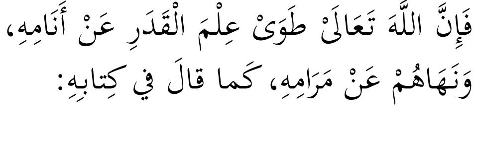Porque en verdad Allah exaltado sea, ha mantenido alejado el conocimiento sobre el decreto lejos de su creación y les prohibió preguntar por este así como Allah dice en Su libro: