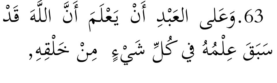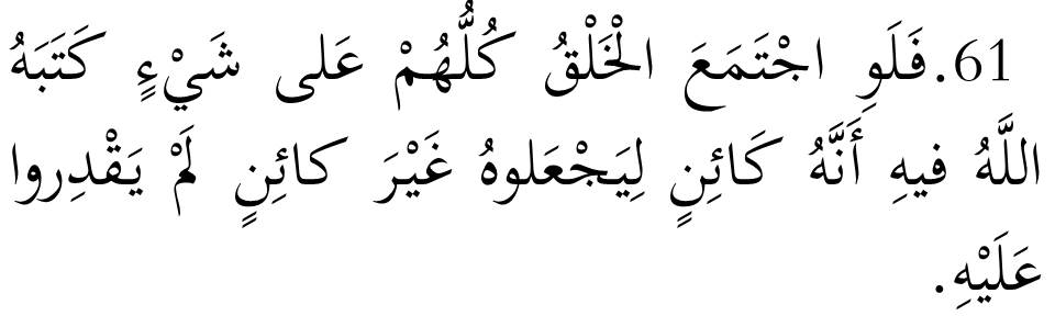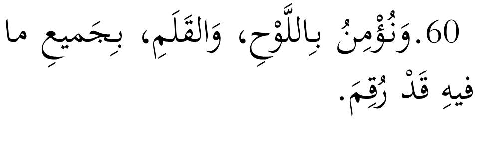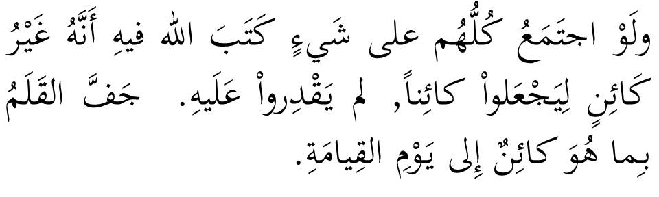Si todas las criaturas se reunieran para que no existiera algo que está escrito por Allah en ella, fallarían y si se unieran para hacer algo que no está escrito que exista no podrían decretarlo. La tinta de la pluma se ha secado y con ella todo lo escrito hasta el día del juicio.