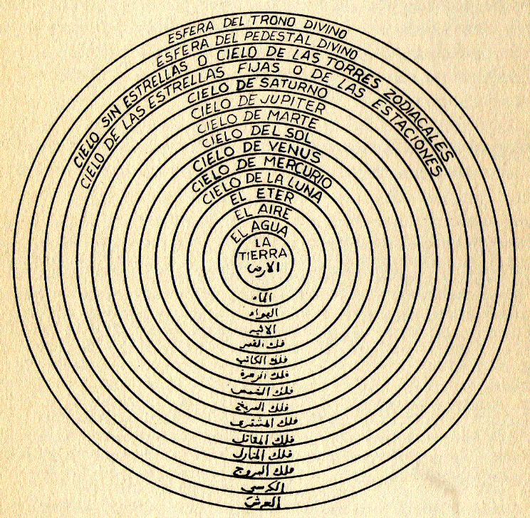 Ibn Arabi describe el cosmos como una estructura jerárquica con diferentes niveles de existencia a menudo denominado «La Jerarquía Divina» o «La Gran Cadena del Ser». En su intrincado marco metafísico, describe un orden estructurado de existencia que abarca varios niveles o grados de realidad, cada uno de los cuales refleja diferentes aspectos de lo Divino. Las jerarquías de la existencia en la cosmología de Ibn Arabi se pueden resumir de la siguiente manera: