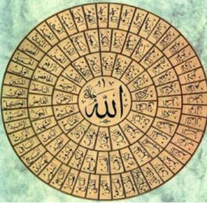 En la visión cosmológica de Ibn Arabi, los Nombres Divinos (Asma’ al-Husna) juegan un papel central y profundo. Su perspectiva sobre los Nombres Divinos está estrechamente entrelazada con su comprensión de la naturaleza de la realidad, la relación entre Dios y la creación, y el viaje espiritual del buscador. Enfatiza la importancia de los Nombres y Atributos Divinos, considerándolos como los principios subyacentes que gobiernan todo el cosmos. Cada entidad o fenómeno en el universo refleja un Nombre Divino específico. Los Nombres Divinos resaltan la tensión entre los aspectos trascendente e inmanente de Dios. Si bien la Esencia Divina está más allá de la comprensión humana, los Nombres brindan un medio a través del cual las personas pueden acercarse y experimentar la presencia de Dios.